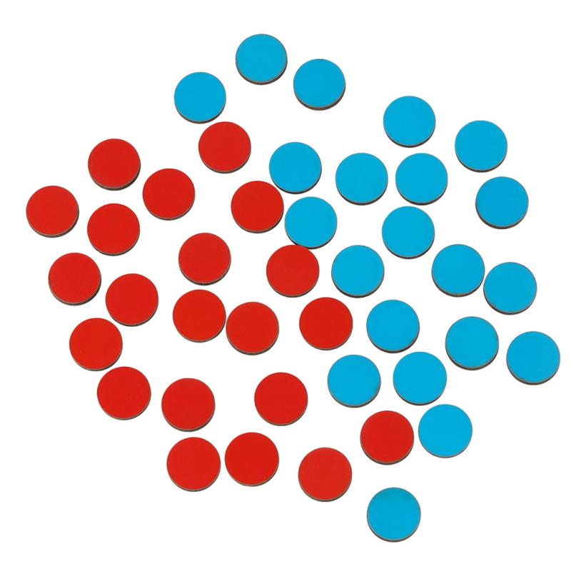 - Drewniane żetony w dwóch kolorach – 21 niebieskich i 21 czerwonych, każdy o średnicy 15 mm i grubości 3 mm, gwarantujączytelność i wygodę użytkowania.
