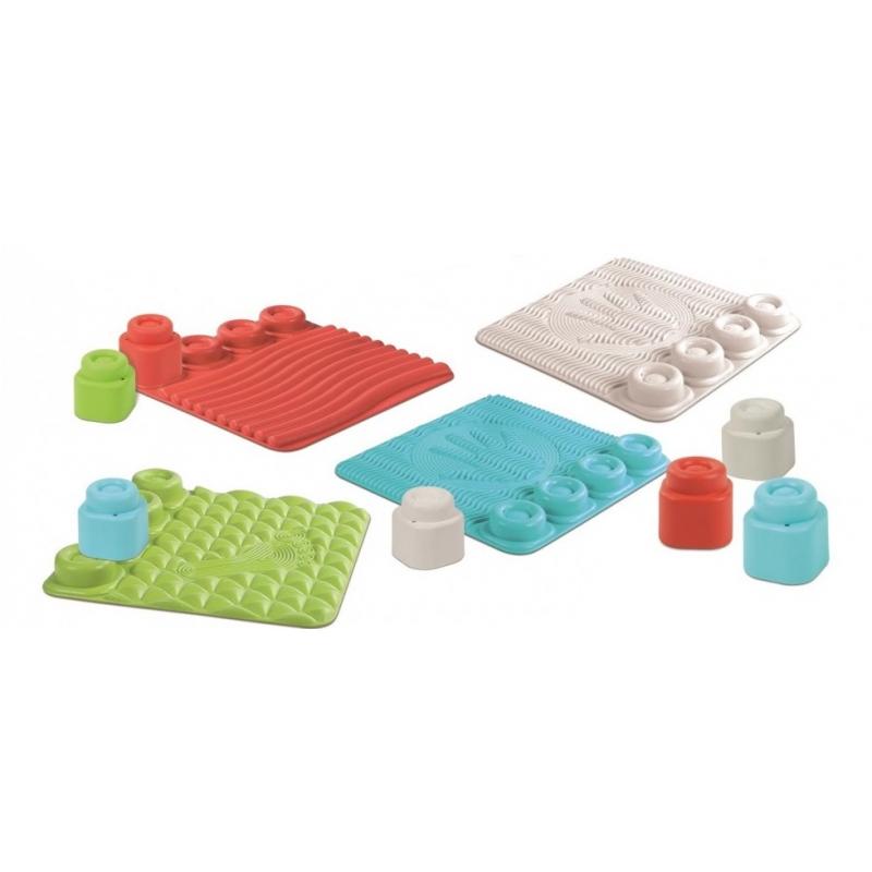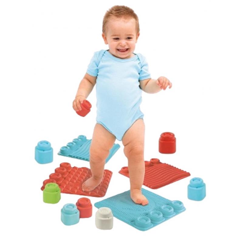 Komplet składa się z 4 miękkich mat oraz 8 kolorowych klocków, które są łatwe do chwytania nawet dla najmłodszych rączek. Wszystkie elementy zaprojektowano tak, by były bezpieczne i przyjazne dla wrażliwej skóry dziecka. Natomiast zróżnicowana faktura powierzchni zapewnia dodatkowe bodźce sensoryczne podczas zabawy.