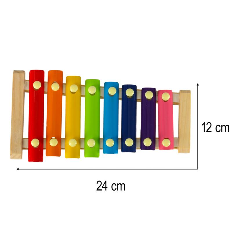 Prezentowane cymbałki drewniane to instrument składający się z ośmiu metalowych blaszek w różnych, żywych kolorach, zamocowanych na solidnej, drewnianej ramie. Wybór ośmiu odmiennych dźwięków pozwala na prostą naukę melodii, co sprzyja rozwijaniu poczucia rytmu oraz słuchu muzycznego. Dzięki nim dziecko nie tylko świetnie się bawi, ale też uczy się rozpoznawania barw oraz ćwiczy cierpliwość i pamięć.