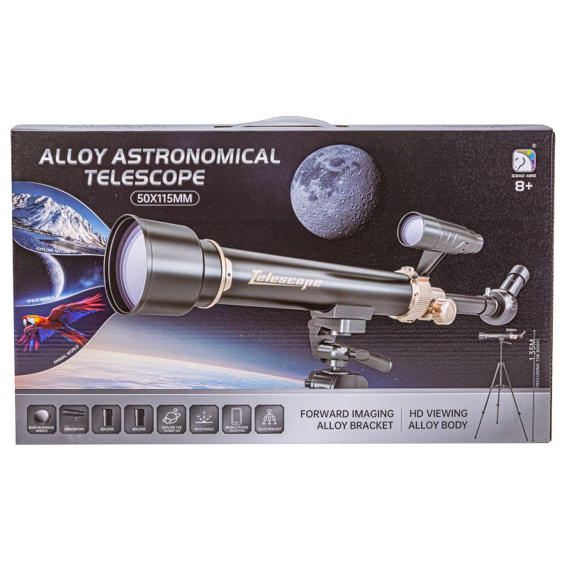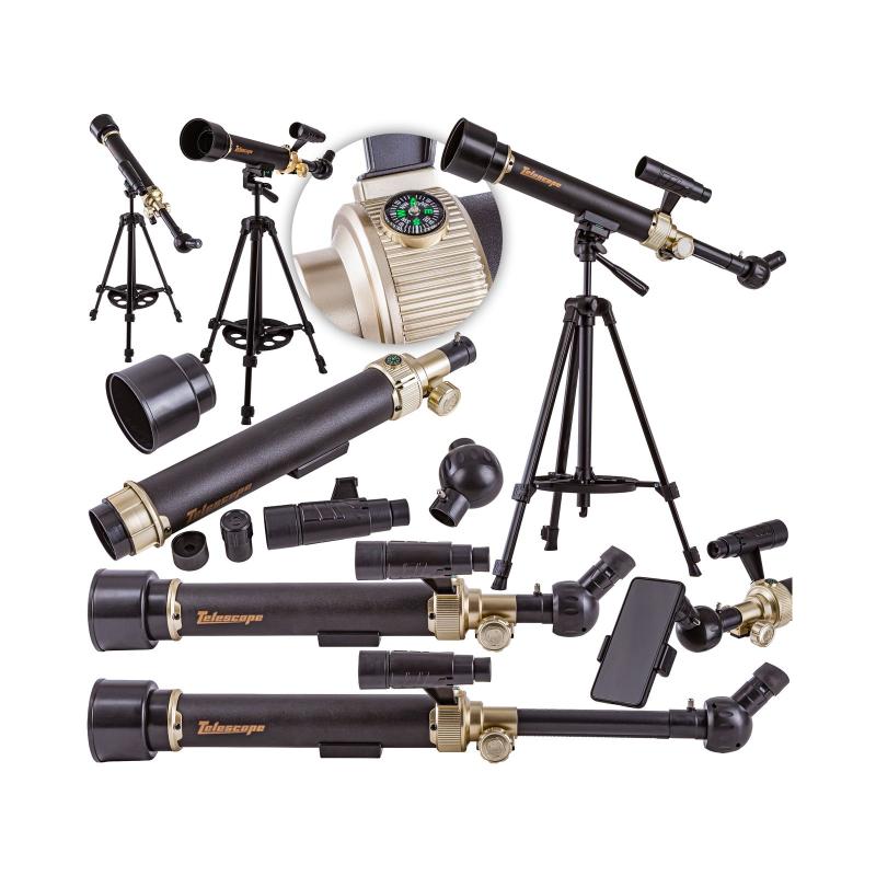Teleskop astronomiczny (czarny, 30x/60x) z teleskopowym trójnogiem i długością 54 cm (regulacja do 69,5 cm), przeznaczony dla dzieci powyżej 8 roku życia. Prosty w obsłudze zestaw łączy naukę z zabawą: dwa okulary 30x i 60x oraz luneta celownicza ułatwiają odnajdywanie obiektów, a regulacje statywu pozwalają precyzyjnie ustawić kąt obserwacji. W opakowaniu znajdziesz uchwyt na telefon, mini poziomicę i kompas, a wymiary opakowania to 51 × 30 × 10,5 cm. Idealny do nocnych obserwacji nieba i dokumentowania odkryć zdjęciami, rozwija ciekawość i umiejętności praktyczne.