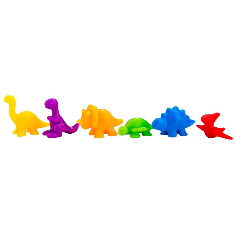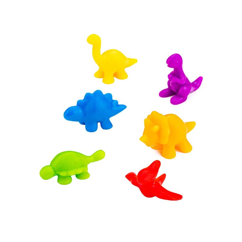 Edukacyjna gra Dinozaury — 48 figurek, 6 miseczek i 2 pęsety; figurki 2,5–3,5 cm, średnica miseczki 8,5 cm, opakowanie 16,5 × 9,5 × 9,5 cm. Kolorowy zestaw ułatwia naukę liczenia i rozpoznawania barw poprzez zabawę: dzieci segregują dinozaury pęsetką do odpowiednich miseczek, ćwicząc precyzję chwytu i skupienie. Figurka wykonana z twardej gumy, zabawka przeznaczona dla dzieci powyżej 3 roku życia, dostępna w sześciu żywych kolorach (czerwony, żółty, pomarańczowy, fioletowy, zielony, niebieski) i zapakowana w tubę. Idealna jako narzędzie edukacyjne wspierające rozwój motoryki i podstaw matematyki.