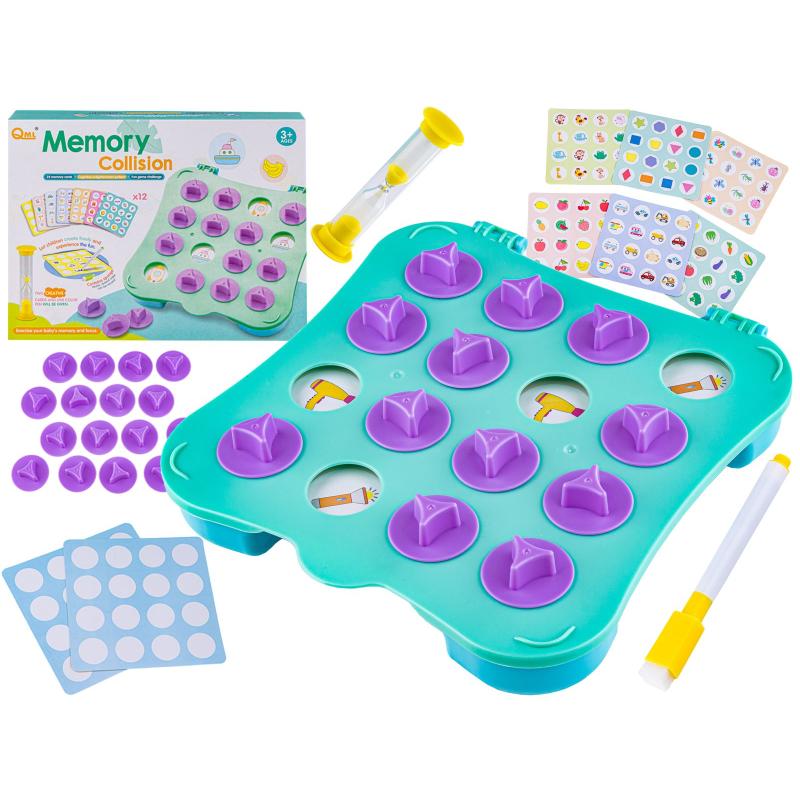 W pudełku znajdziesz praktyczną podstawkę, 12 dwustronnych plansz z różnorodnymi ilustracjami, 16 kolorowych guziczków oraz pisak do tworzenia własnych par na dwóch planszach bez wzorów. Do zestawu dołączona jest także klepsydra, którą można wykorzystać do odmierzania czasu podczas odsłaniania obrazków, co podnosi dynamikę rozgrywki i wprowadza element rywalizacji.