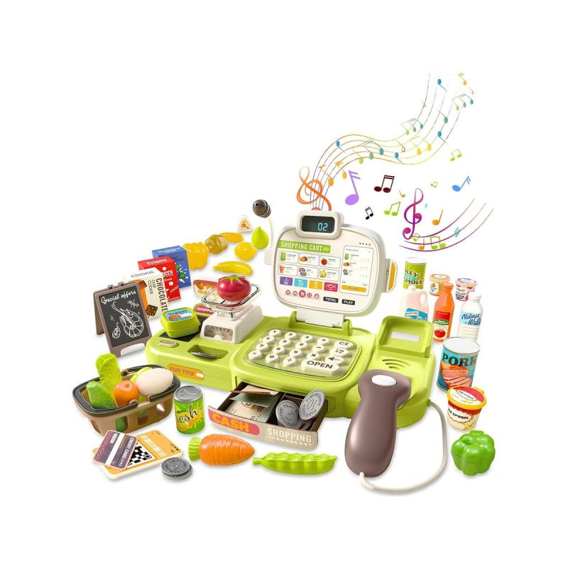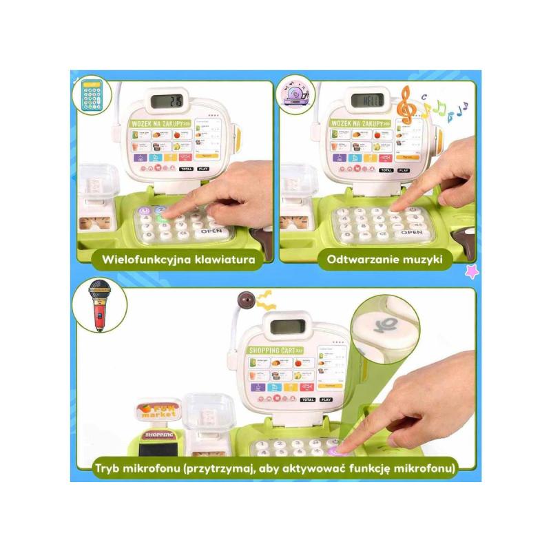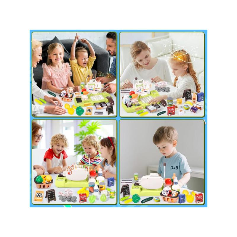 Kasa rozpoznaje konkretne produkty (zielona papryka, fasola, pomidor, marchewka, butelka wody, puszka napoju, jajko, kubek lodów) i po zeskanowaniu „nabija” je na rachunek, a kalkulator sumuje kwoty. Wbudowana waga umożliwia dokładne ważenie warzyw i owoców, co uczy jednostek i praktycznego podejścia do zakupów. Dzięki mikrofonowi i funkcji powitań w języku angielskim zabawa łączy rozwój komunikacji z nauką podstaw języka.