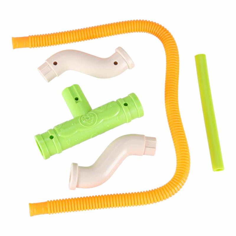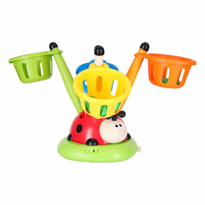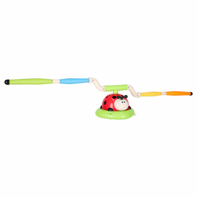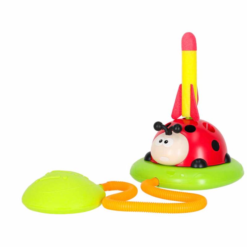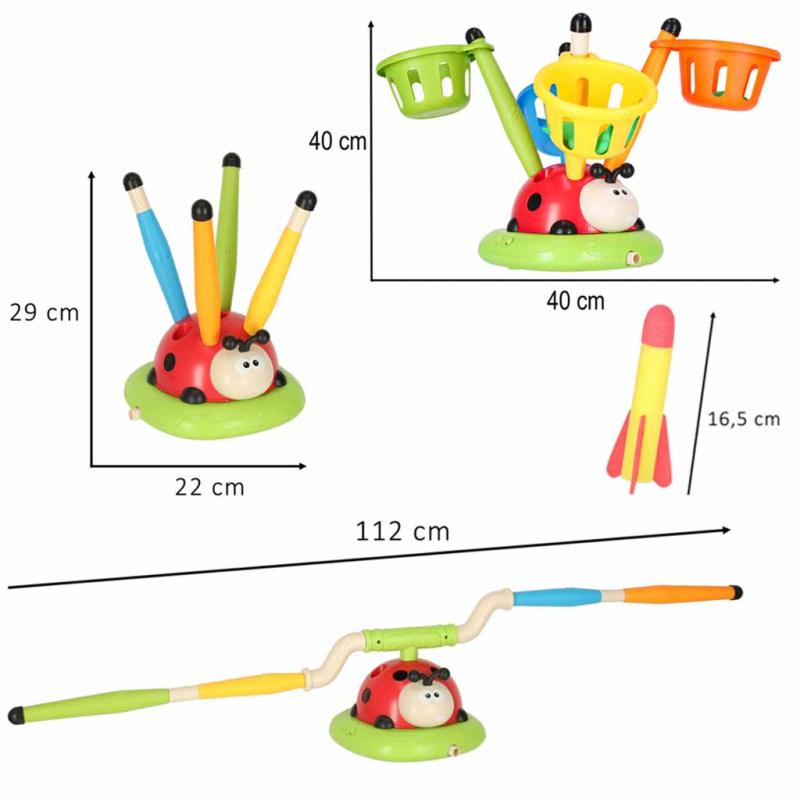 W skład kompletu wchodzi m.in. kolorowa biedronka, która stanowi centralny element zabawy i wyróżnia się efektownym obracaniem oraz melodyjkami generowanymi podczas użytkowania. Dołączona pompka nożna służy jako wyrzutnia powietrza, umożliwiając dynamiczne rzuty woreczkami lub kółkami do celu. Różnorodne rurki i rozgałęziacze pozwalają na tworzenie torów przeszkód do przeskakiwania, co sprzyja aktywności fizycznej i ćwiczeniu zręczności.