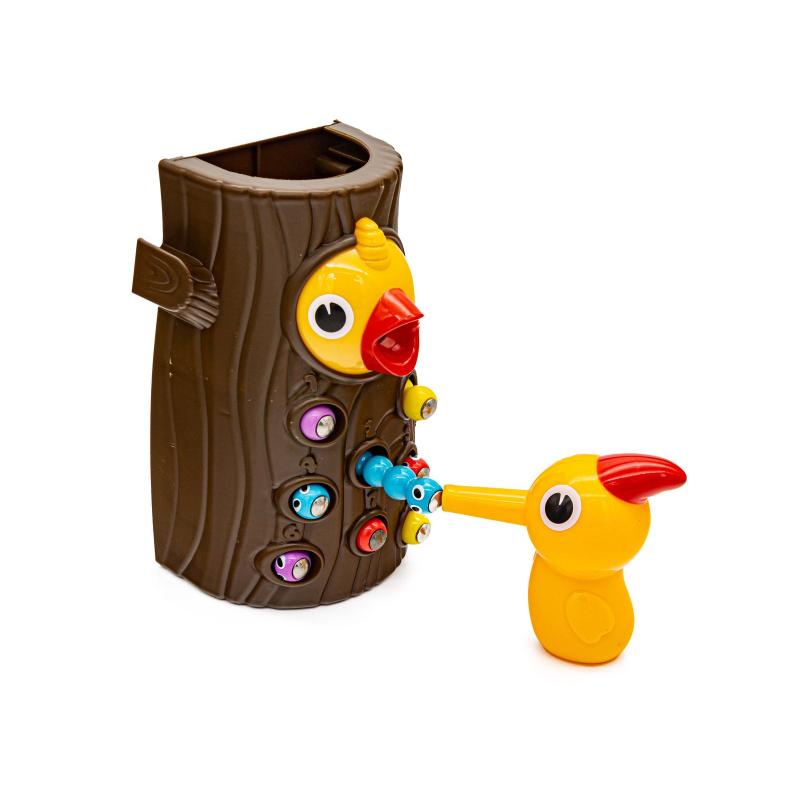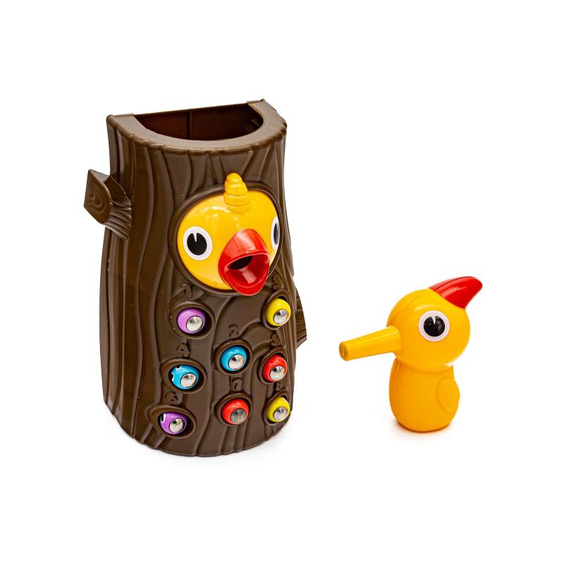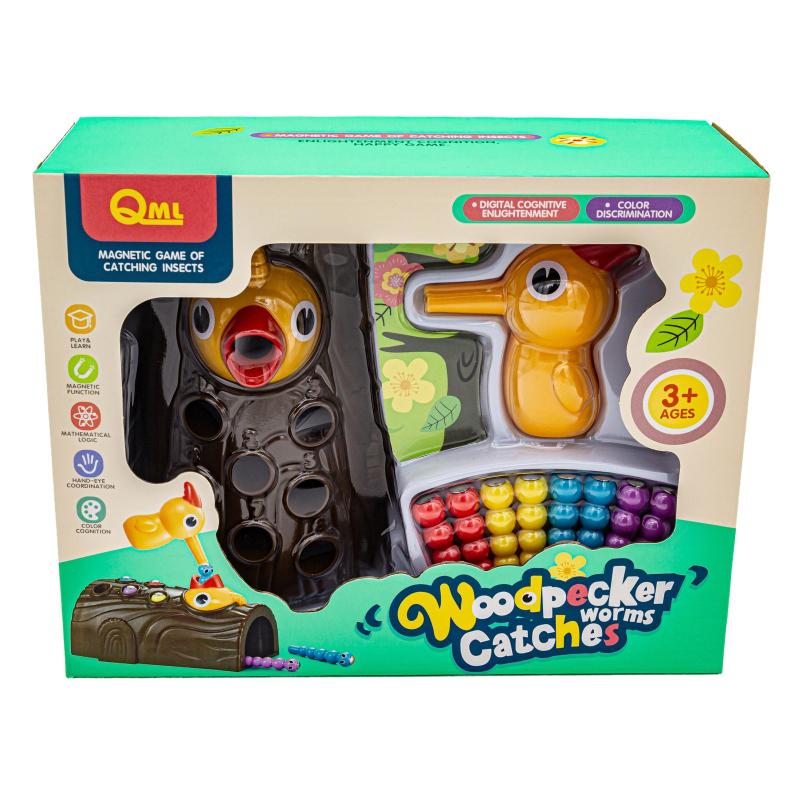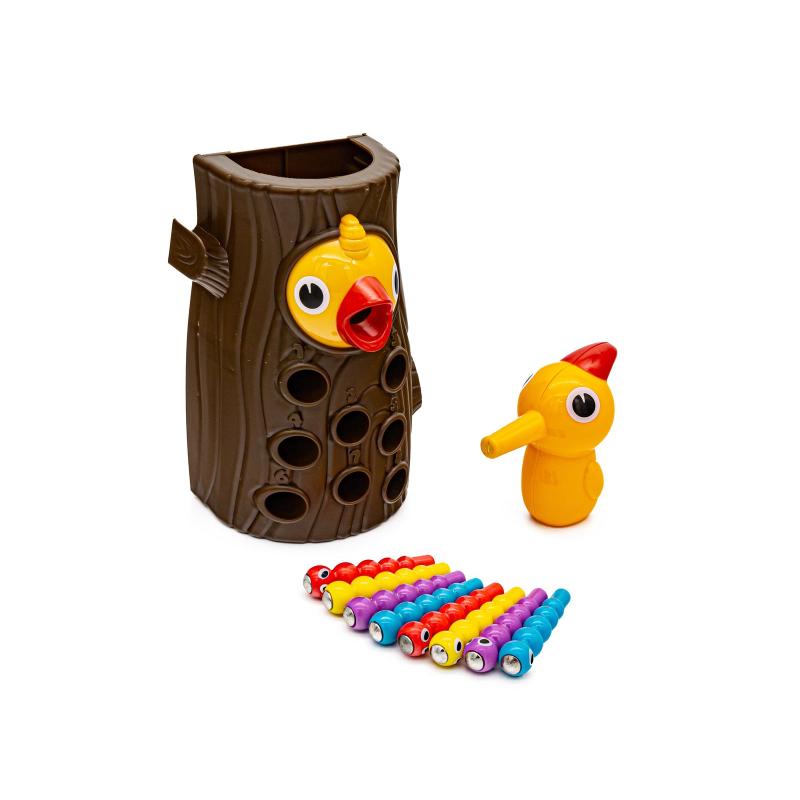 W tej grze dziecko wciela się w rolę ptasiej mamy, używając magnetycznego dzięcioła do wyciągania robaczków z kłody i podawania ich głodnemu pisklakowi. Prosta mechanika opiera się na magnesach — dzięki temu elementy nie odpadają łatwo, a rozgrywka jest stabilna nawet poza domem. Brak konieczności stosowania baterii sprawia, że zabawka jest gotowa do użycia zawsze i wszędzie.