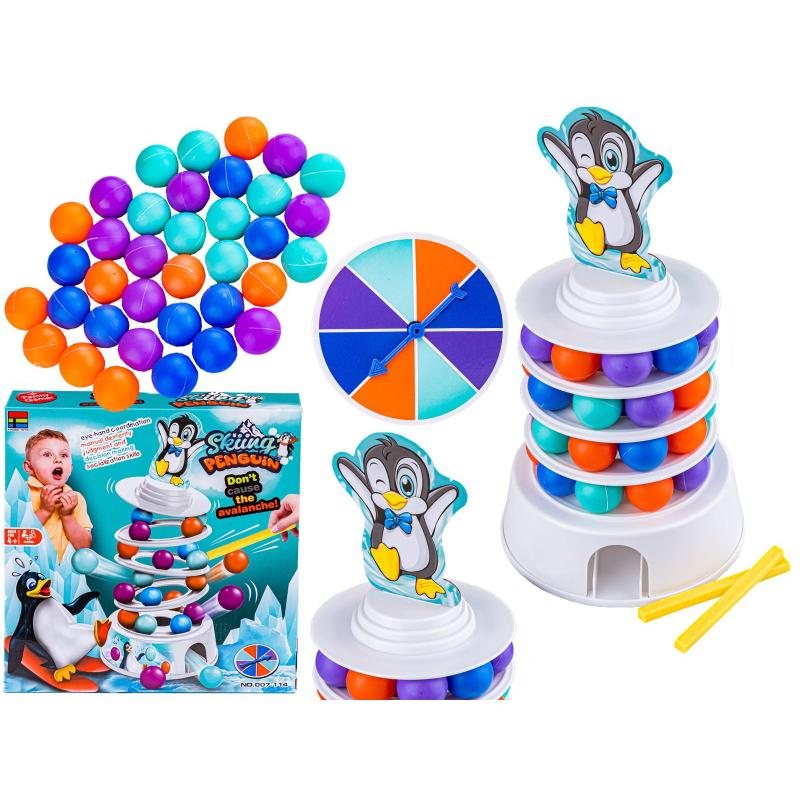 Gra zręcznościowa Pingwin Na Nartach, pingwinek na ruchomej wieży — po złożeniu wys. ok. 28 cm, średnica podstawy ok. 15,5 cm, piłeczki Ø ok. 2,9 cm. Gra polega na delikatnym wyjmowaniu piłeczek z chwiejnej konstrukcji przy pomocy dwóch patyczków, tak by nie przewrócić wieży i nie zrzucić tekturowego pingwinka. Zestaw zawiera podstawę, 3 okrągłe podstawki i czubek wieży, tekturowego pingwinka, tarczę z wskazówką oraz 36 piłek: 9 granatowych, 9 pomarańczowych, 9 błękitnych i 9 fioletowych. Opakowanie: 26,5 × 26,5 × 5,5 cm. Świetna propozycja na rodzinną zabawę rozwijającą cierpliwość i zręczność.