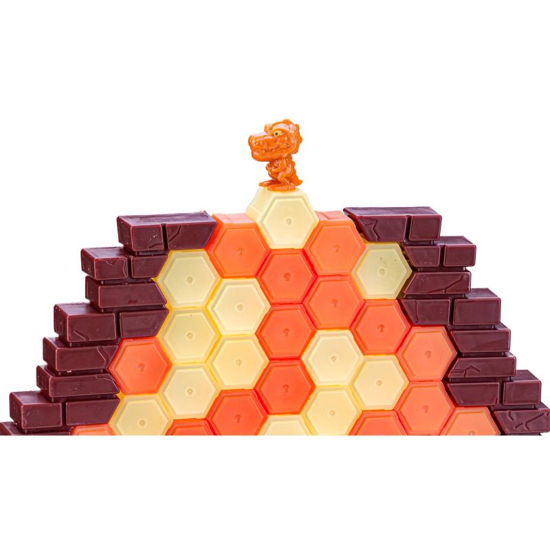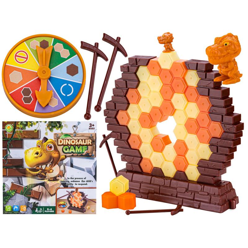 W tej grze zadaniem graczy jest zbudować mur z kolorowych bryłek ziemi na specjalnej podstawie z bocznymi ściankami, ustawić na nim figurkę dinozaura i na zmianę uderzać młotkiem w wylosowany element. Koło losujące wskazuje, czy uderzamy w bryłkę beżową, pomarańczową, losową albo tracimy kolejkę — prosty mechanizm, który potrafi wywołać dużo napięcia i śmiechu przy każdym zakręceniu. Wygrywa ten, kto najdłużej utrzyma dinozaura na krawędzi; przegrywa gracz, którego ruch spowoduje upadek figurki.
