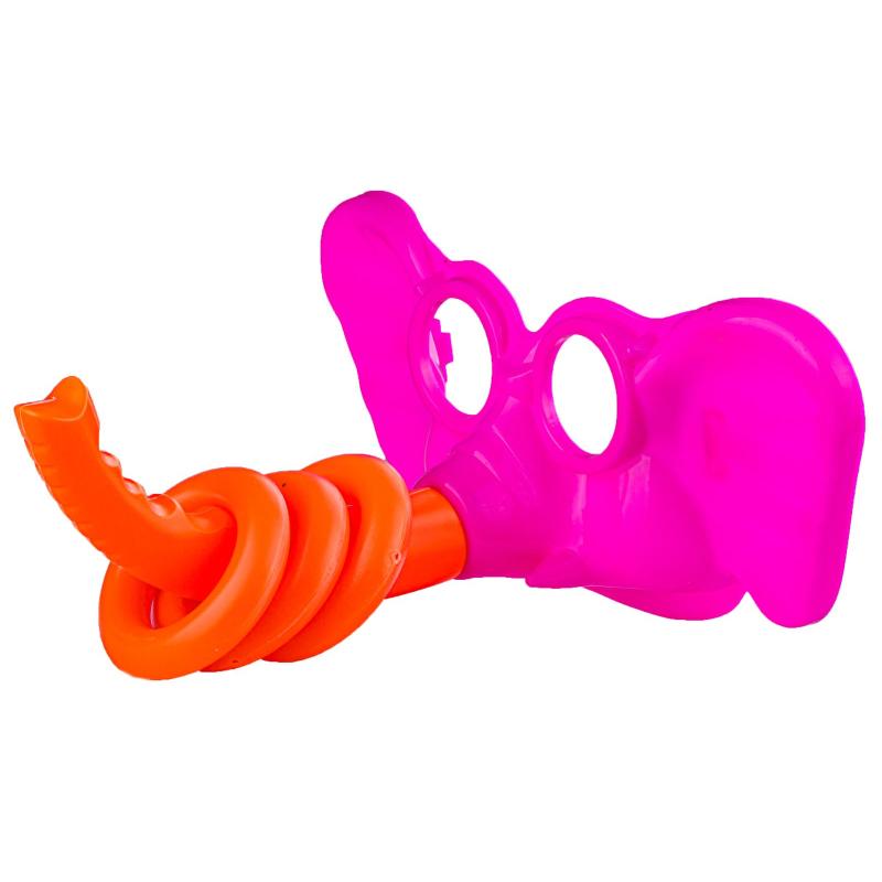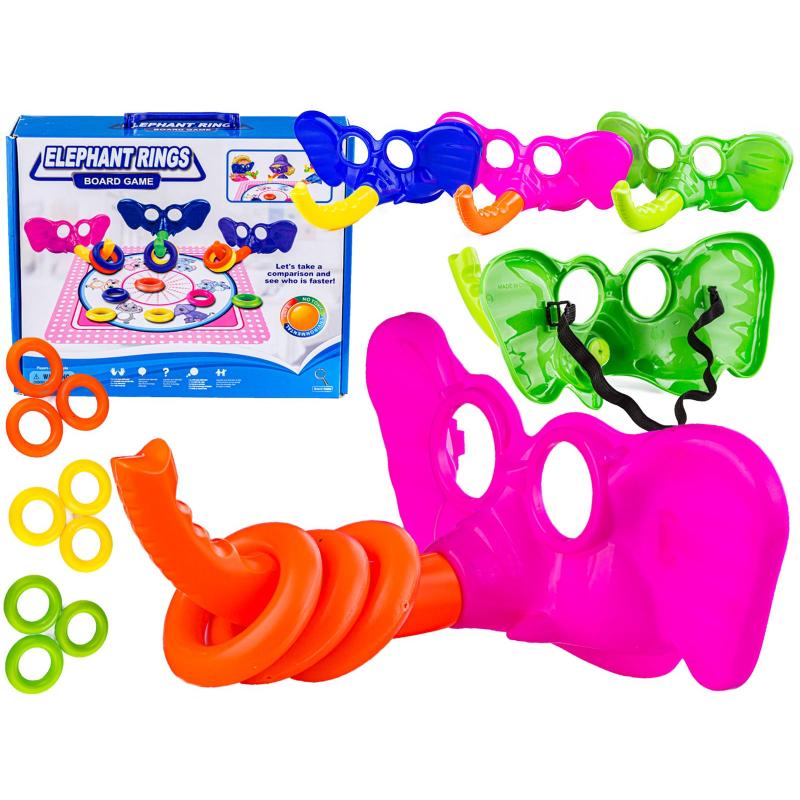 W komplecie znajduje się plansza do gry, 3 maski słonia z trąbami, 9 obręczy oraz 3 mocowania masek, co pozwala na natychmiastowe rozpoczęcie zabawy dla kilku osób. Maski mają szerokość 24 cm, a ich obwód jest regulowany elastyczną gumką, dzięki czemu dopasują się do różnych rozmiarów głów dzieci i dorosłych. Obręcze o średnicy 6,5 cm zostały tak zaprojektowane, by łatwo łapać je na trąbę, a jednocześnie nie były zbyt ciężkie ani niebezpieczne w użytkowaniu.