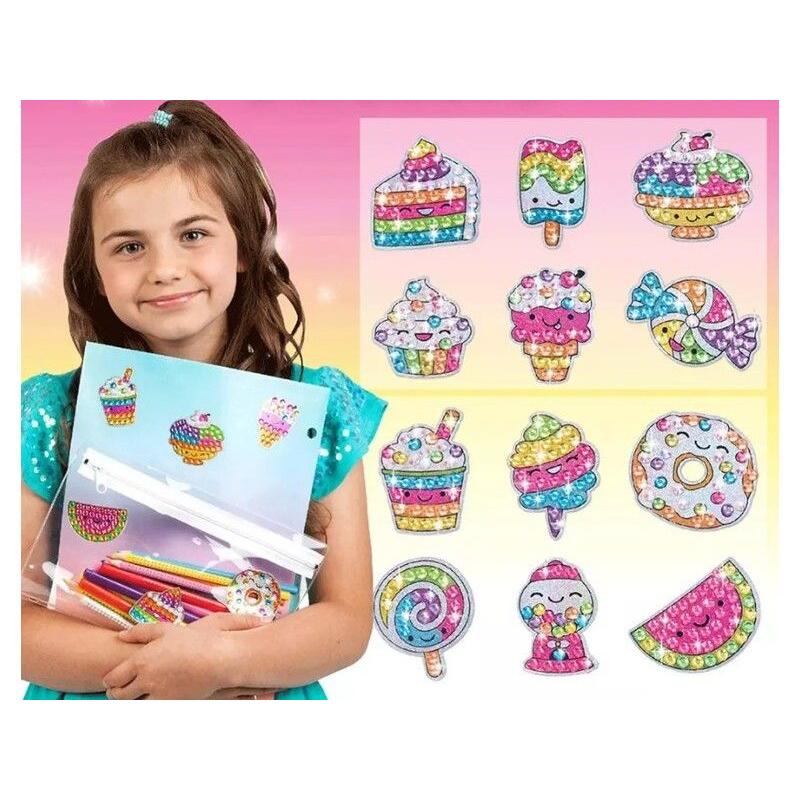 Zestaw zawiera 12 naklejek z wzorami do wyklejenia na holograficznym tle oraz 2 duże ozdoby — tort i deser lodowy — które stanowią centralne elementy kompozycji. Diamenciki są okrągłe i posegregowane w pudełku z przegródkami, dostępne w 7 kolorach: różowym, żółtym, pomarańczowym, fioletowym, zielonym, niebieskim oraz białym, co ułatwia szybkie sortowanie i pracę bez bałaganu.