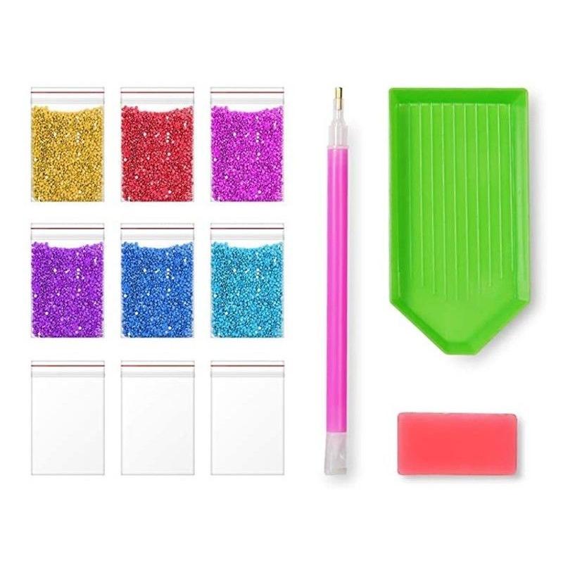 - Zawartość zestawu: płótno z warstwą kleju i nadrukiem, okrągłe i posegregowane diamenciki, aplikator, suchy klej na kostkach, oryginalne opakowanie