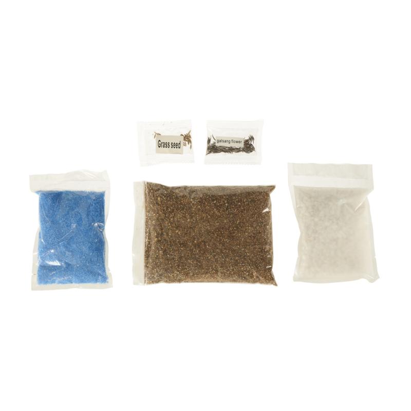 - Ziemia oraz zestaw nasion trawy i kwiatu Kosmos Pierzasty