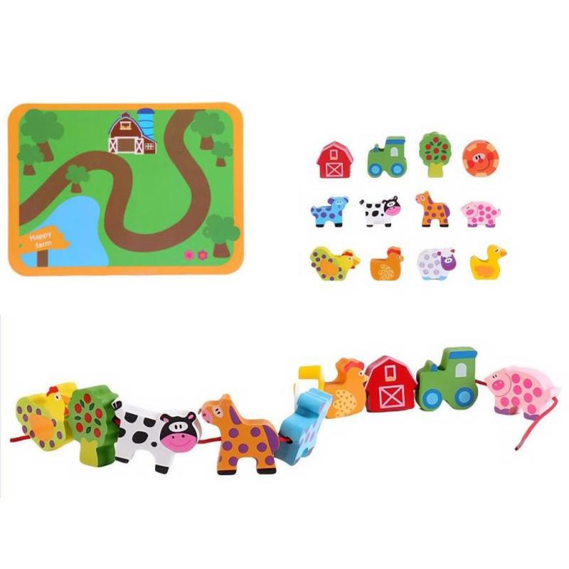 Zestaw zawiera kolorową tablicę, która przedstawia sielankowy obraz farmy oraz 12 drewnianych klocków w kształcie zwierząt gospodarskich i elementów wiejskiego krajobrazu. Klocki można układać na planszy lub nawlekać na sznurek, co sprzyja ćwiczeniu koordynacji ręka-oko i precyzji manualnej. Wygodna długość sznurka (90 cm) umożliwia swobodne nawlekanie podczas zabawy i wspólnego tworzenia historyjek związanych z wiejskim życiem.