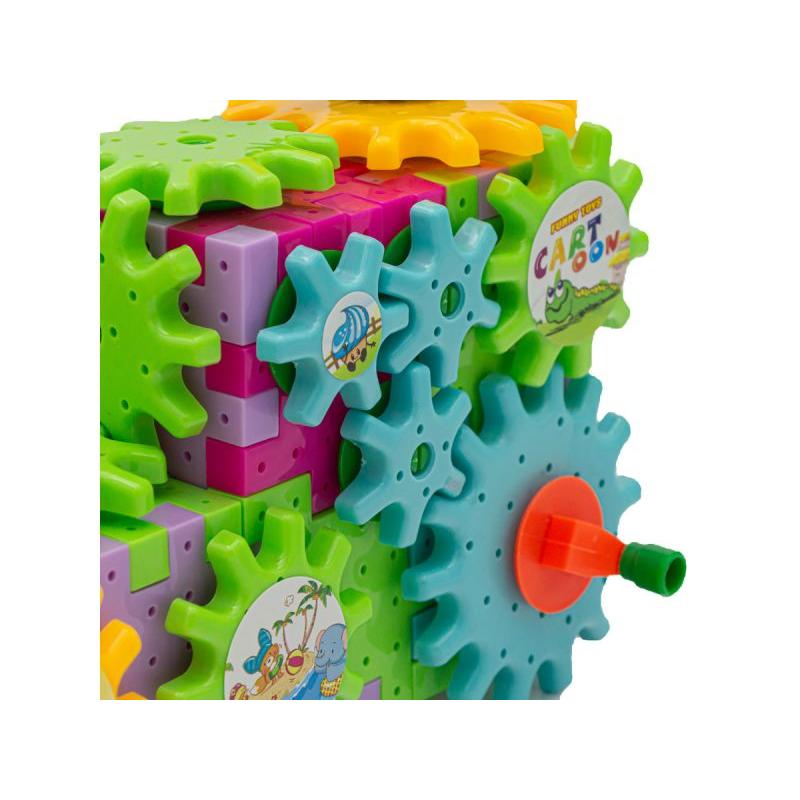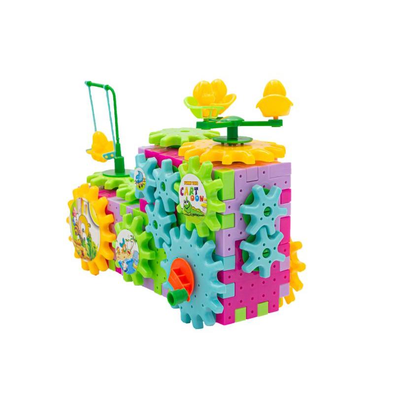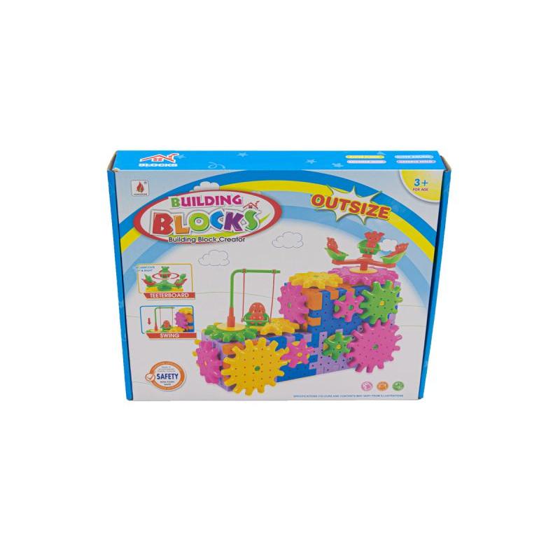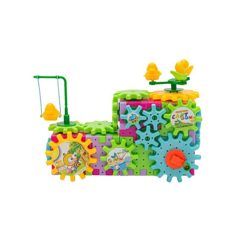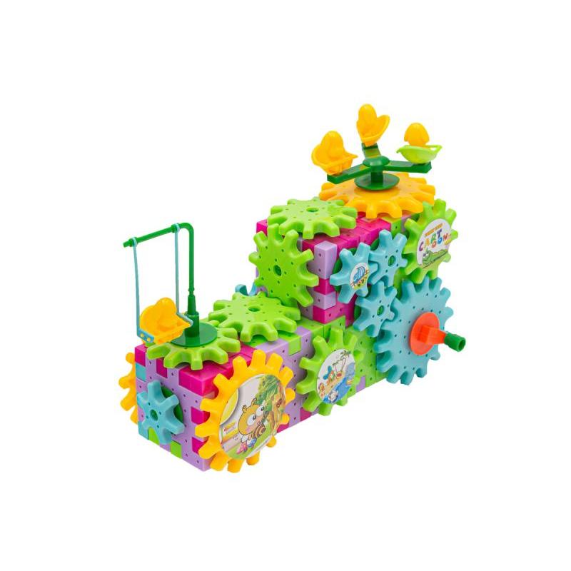 Klocki konstrukcyjne 78 elementów — kolorowy zestaw dla dzieci 3+, opakowanie 33 × 27,5 × 5 cm, bogaty wybór plastikowych modułów do samodzielnego projektowania, montażu i zabawy. Elementy łączy się prosto na wcisk, zestaw zawiera koła zębate, zwierzątka, huśtawkę i karuzelę, co urozmaica konstrukcje i wprowadza ruchome fragmenty. Największa zębatka ma średnicę 8,5 cm, pojedynczy element konstrukcyjny ma wymiary ok. 7 × 7 × 1 cm, w komplecie 78 części. Zabawka stymuluje kreatywność i zdolności manualne, pozwalając dziecku tworzyć wieże i pojazdy oraz ćwiczyć rozumowanie przestrzenne podczas zabawy.