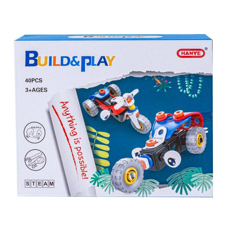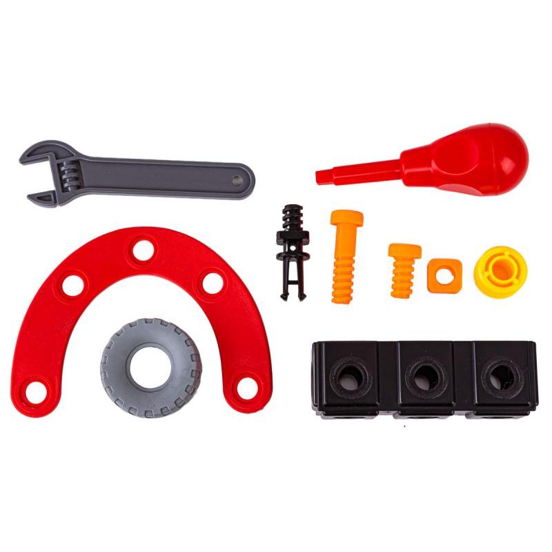 - W zestawie: różnokształtne klocki, śrubokręt, klucz płaski, śruby z nakrętkami, koła, obrazkowa instrukcja, oryginalne opakowanie