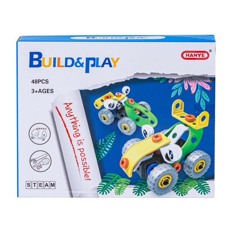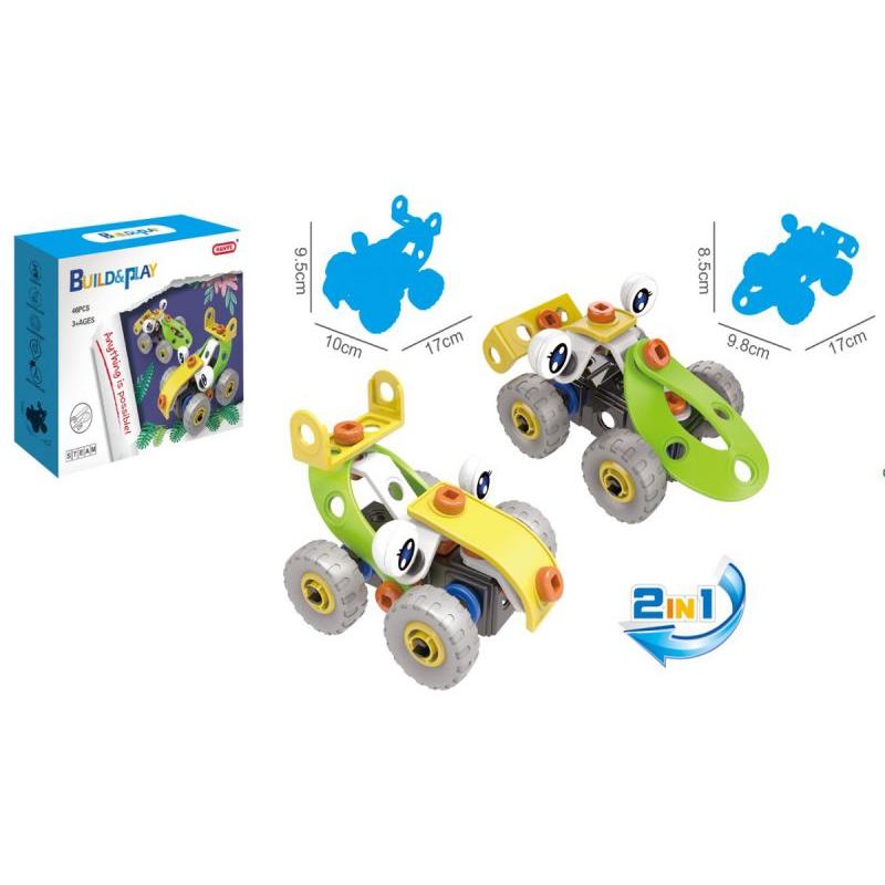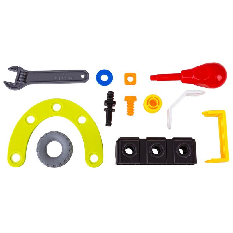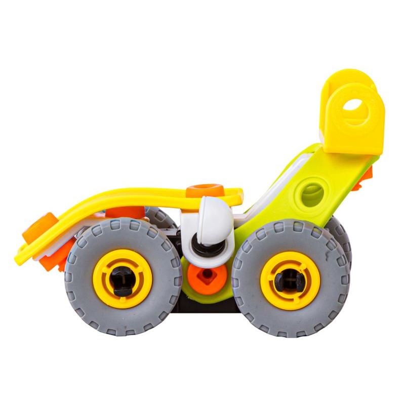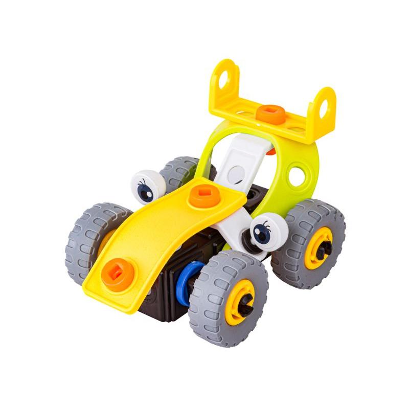 - W zestawie: różnokształtne klocki, śrubokręt, klucz płaski, śruby z nakrętkami, koła, obrazkowa instrukcja, oryginalne opakowanie