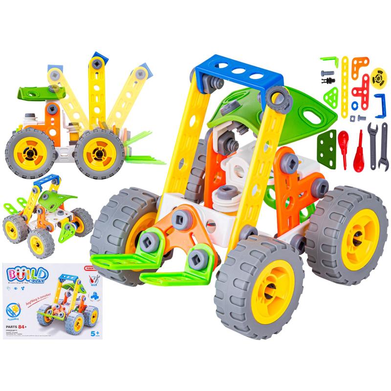 Klocki konstrukcyjne 84 el. — elastyczne elementy to zestaw kreatywny, który zmienia wolny czas dziecka w praktyczną zabawę warsztatową; pozwala na składanie i rozkręcanie modeli, rozwijając zdolności manualne i wyobraźnię. Dzięki gumowanym częściom i instrukcji obrazkowej dziecko może zbudować m.in. wózek widłowy oraz inne pojazdy i konstrukcje.