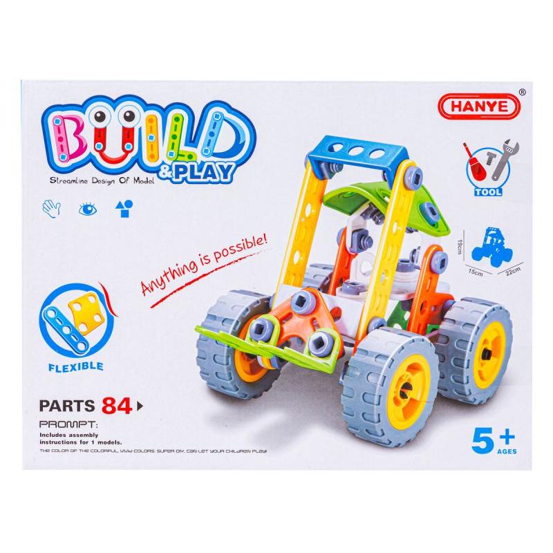 - W zestawie: różnokształtne klocki, śrubokręt i klucz płaski, śruby mocujące z nakrętkami, koła, obrazkowa instrukcja, oryginalne opakowanie