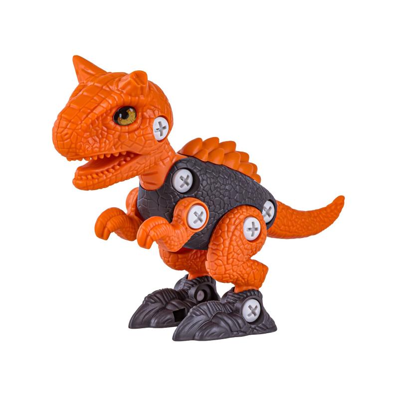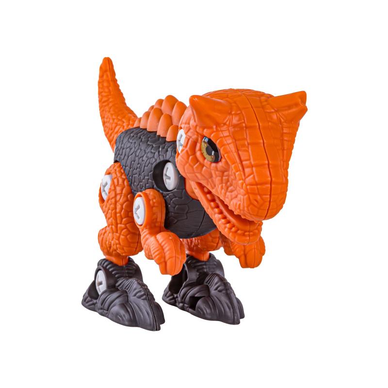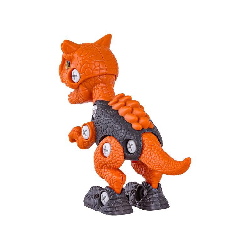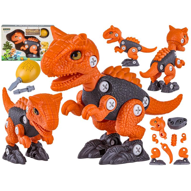 Klocki konstrukcyjne DINOZAUR do skręcania i rozkręcania, pomarańczowy, wymiary złożonego dinozaura 13 × 20,5 × 7 cm, dla dzieci powyżej 3 roku życia. Zestaw zawiera elementy składowe do zbudowania dinozaura, śrubki oraz wkrętak w kształcie jajka z wymiennymi końcówkami i oryginalnym opakowaniem; po złożeniu dinozaur ma ruchome części: głowę, łapki, stópki i ogon, które pozwalają ustawiać figurkę w różnych pozach. Zabawka rozwija zdolności manualne, logiczne myślenie i kreatywność, angażując małych majsterkowiczów w dłuższą, twórczą zabawę oraz naukę cierpliwości i planowania przy składaniu.