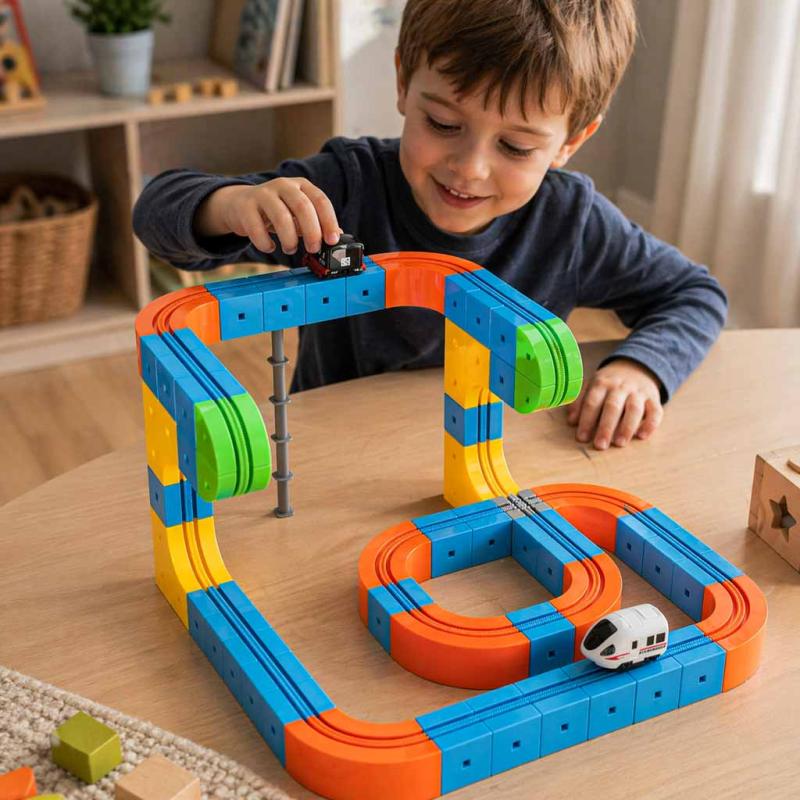 Przy projektowaniu torów i pociągów ważna jest stabilność i możliwość szybkich modyfikacji; ten zestaw sprawdzi się zarówno podczas samodzielnej zabawy, jak i w grupie — pozwala na równoczesne budowanie kilku fragmentów trasy i późniejsze ich połączenie, co rozwija współpracę i umiejętność planowania.