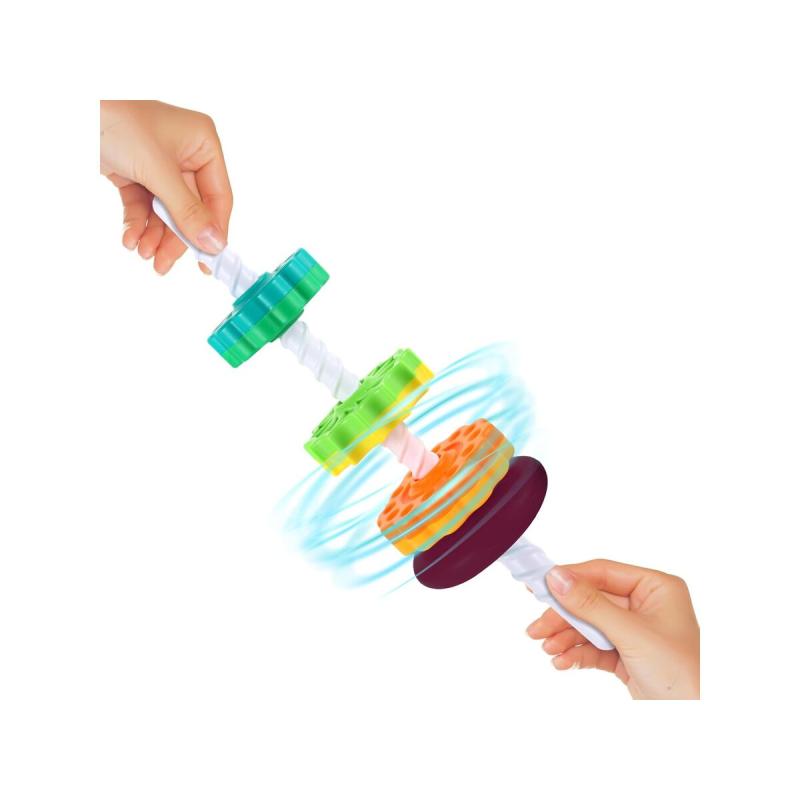 Dzięki różnym fakturom i intensywnym barwom zabawka stymuluje zmysły wzroku i dotyku, a ruchome elementy dodatkowo wspomagają rozwój koordynacji ręka–oko. Pałąk można wyjąć z podstawy, co pozwala na obracanie krążków w obie strony i urozmaica gry sensoryczne.