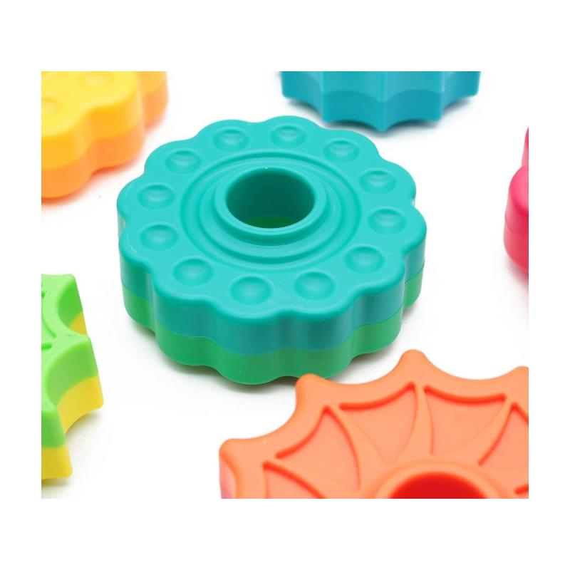 Model "Piramida Sensoryczna Zakręcona Wieża – Kolorowe Krążki" składa się z sześciu barwnych krążków o różnych kształtach, które dziecko nakłada na plastikowy, zakręcony pręcik. Krążki zsuwając się po pręciku obracają się, co przyciąga uwagę i wydłuża koncentrację podczas zabawy. Maluch może układać elementy według własnego pomysłu albo według schematu — od największego do najmniejszego lub odwrotnie — co uczy porządkowania i sekwencji.