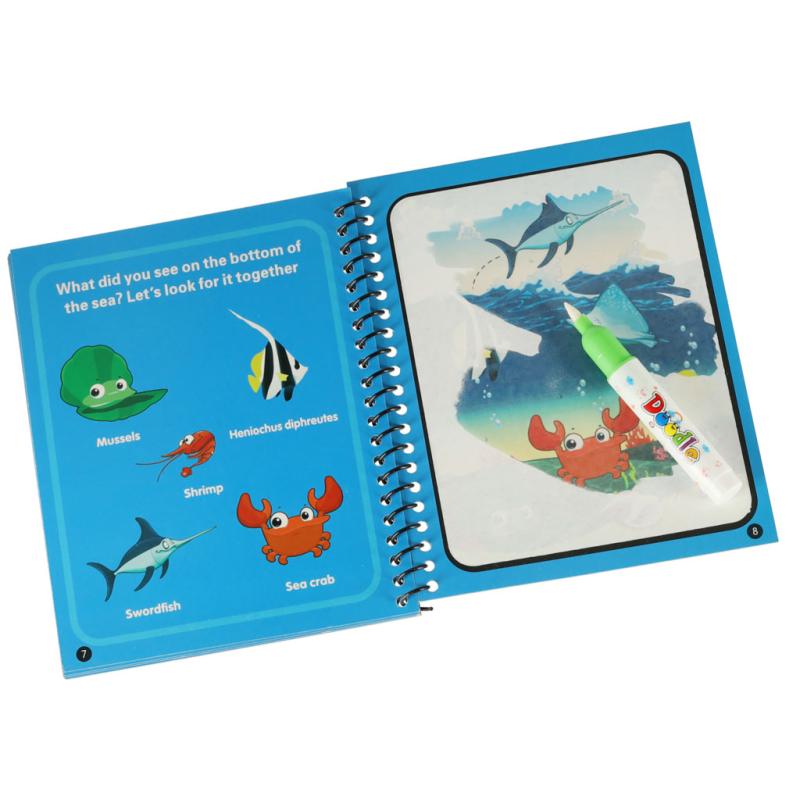 W środku znajduje się specjalna książeczka z rysunkami przedstawiającymi zwierzęta morskie oraz prosty mazak, który napełnia się wodą. Po zwilżeniu końcówki mazaka i malowaniu po stronach pojawiają się żywe barwy — bez farb, kredek czy brudzących tuszy. To rozwiązanie sprawia, że zabawa jest czysta, łatwa do przygotowania i odpowiednia nawet dla najmłodszych dzieci, które dopiero ćwiczą zdolności manualne.
