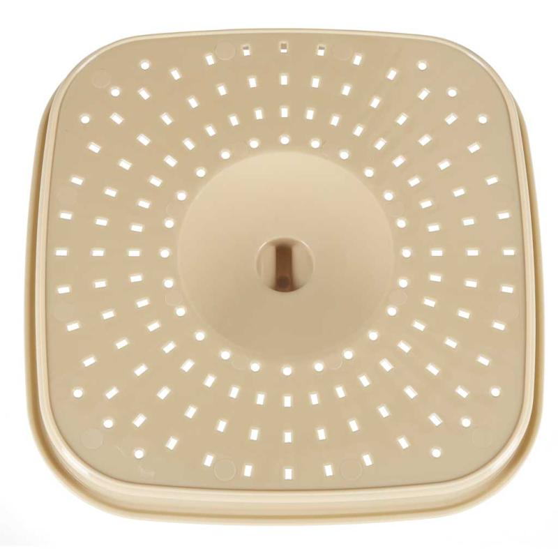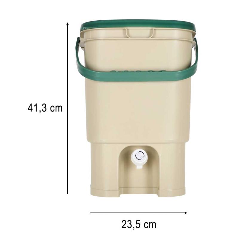 Produkt wykonany z tworzywa w odcieniach beżu i zieleni ma maksymalne obciążenie 19 kg, więc bez obaw można wkładać do niego większe ilości bioodpadów. Wysokość pojemnika to 41,3 cm, głębokość wewnętrzna 33 cm, a szerokość na górze wynosi 29 × 29 cm (szerokość całkowita z uchwytami 31 × 29 cm), natomiast szerokość na dole to 23,5 × 23,5 cm.
