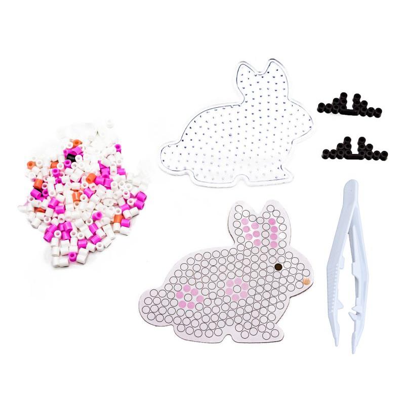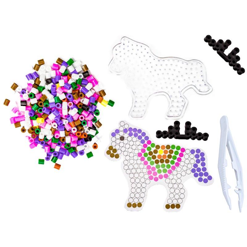 Zestaw zawiera 2000 plastikowych koralików w różnorodnych kolorach oraz wszystkie akcesoria niezbędne do tworzenia: kuferek z pokrywką, 2 podkładki do układania, szablony w kształcie króliczka i jednorożca, pęsetę, 4 czarne podkładki pod zaprasowane wzory oraz papier do prasowania. Dzięki pęsecie nawet drobne paluszki radzą sobie z układaniem, a kuferek ułatwia przechowywanie i transport gotowych projektów.