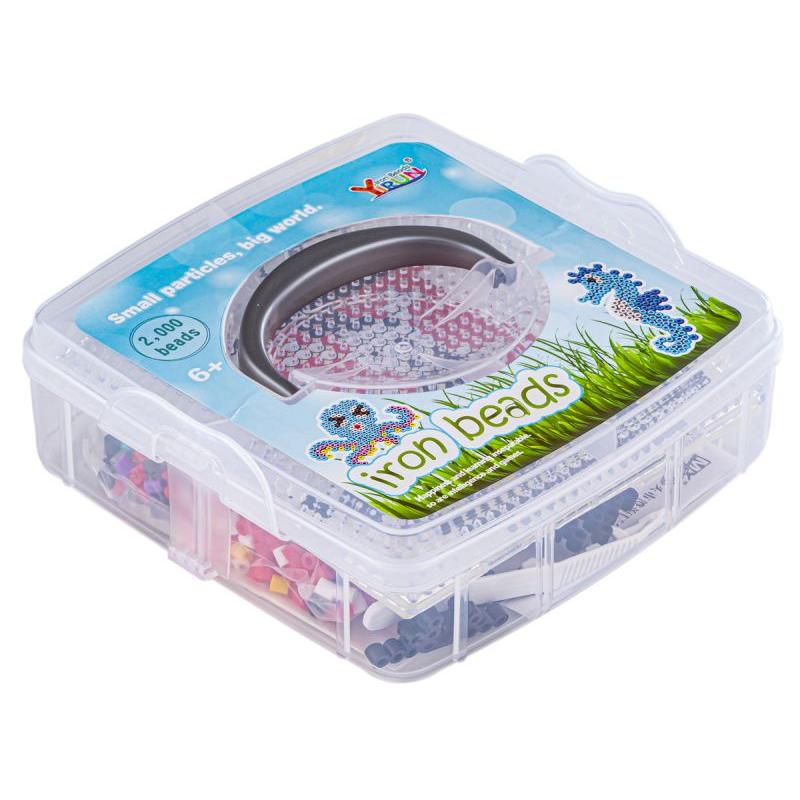 Koraliki do prasowania – zestaw 2000 elementów, średnica koralika 5mm, opakowanie ok. 17,2 × 16,5 × 6 cm. Zestaw zawiera kuferek z pokrywką, 2 podkładki do układania i szablony OŚMIORNICA oraz KONIK MORSKI; jest odpowiedni dla dzieci powyżej 6 roku życia. Kolorowe koraliki pozwalają tworzyć obrazy, breloczki i dekoracje; po ułożeniu wzoru przykryj papierem do pieczenia i przyprasuj żelazkiem (przy udziale osoby dorosłej). Praca z koralikami rozwija kreatywność, motorykę małą i koncentrację, a gotowe prace można wykorzystać jako ozdoby lub praktyczne upominki. Zestaw zawiera też pęsetę, papier do prasowania i 4 czarne podkładki.