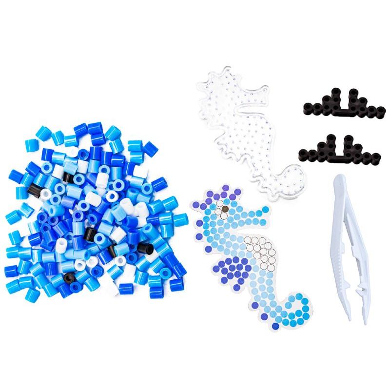 - Elementy w zestawie: kuferek z pokrywką, koraliki w różnych kolorach, 2 podkładki i szablony (OŚMIORNICA, KONIK MORSKI), pęseta, 4 czarne podkładki pod wzory, papier do prasowania