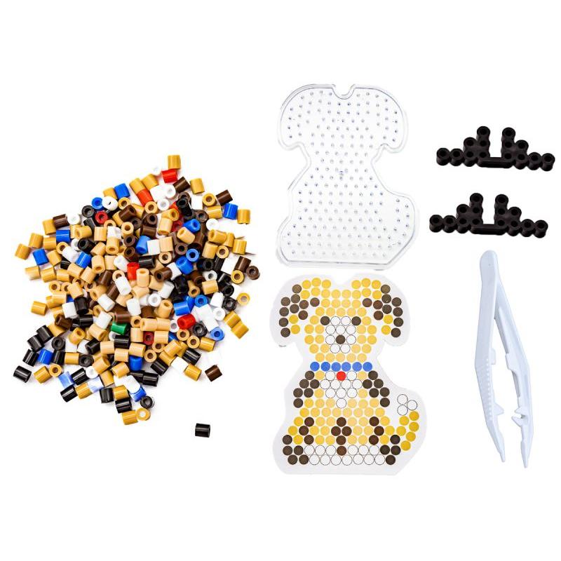 Najlepiej zacząć od gotowych szablonów dołączonych do zestawu — piesek i żółwik pomagają zapoznać się z układaniem i proporcjami. Dorosły może pokazać, jak używać pęsety i jak przygotować prasowanie, a następnie nadzorować pierwsze prasowanie żelazkiem. Po kilku próbach dziecko szybko nabierze pewności i zacznie tworzyć własne wzory.