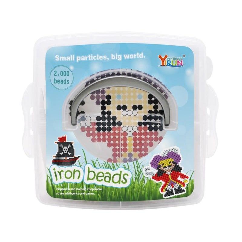 Zestaw zawiera 2000 koralików w różnych kolorach oraz praktyczny kuferek z pokrywką, który ułatwia przechowywanie elementów i szablonów. W komplecie znajduje się kwadratowa podkładka do układania o wymiarach 14,5 × 14,5 cm, dwa szablony (pirat oraz statek piracki), pęseta ułatwiająca precyzyjne układanie, 4 czarne podkładki pod zaprasowane wzory oraz papier do prasowania. Dzięki tak skompletowanym elementom dzieci mogą projektować breloczki, zawieszki, małe obrazy czy podkładki pod kubek.
