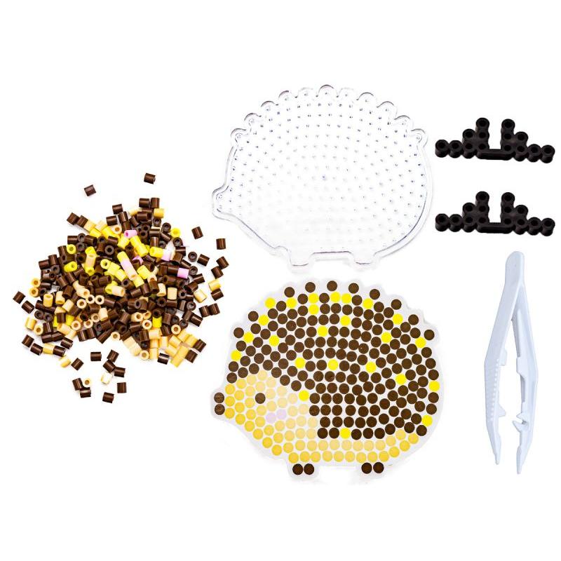 - W zestawie: kuferek z pokrywką, koraliki w przeróżnych kolorach, 2 podkładki do układania, szablony SÓWKA i JEŻYK, pęseta, 4 czarne podkładki pod zaprasowane wzory, papier do prasowania