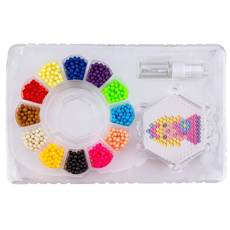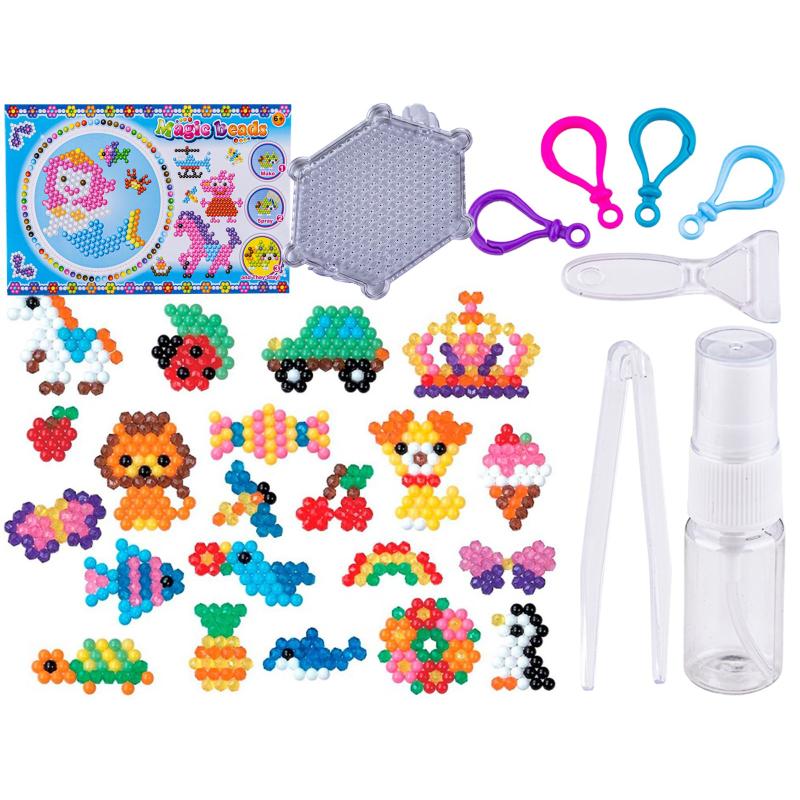 Zestaw zawiera około 1000 koralików w 12 kolorach oraz wszystkie narzędzia potrzebne do tworzenia: sześciokątną podkładkę (ok. 9,5 × 9,5 cm), pęsetę, spryskiwacz (butelka z atomizerem ok. 8 cm), szpachelkę do wyrównywania, 4 zawieszki, książeczkę z wzorami i oryginalne opakowanie. Koraliki mają średnicę ok. 5 mm, co pozwala na tworzenie precyzyjnych kształtów i detali, a instrukcja zawiera przykładowe motywy, w tym postać syrenki.