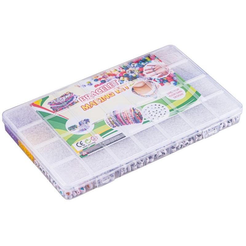 Dodatkowo w pudełku znajdują się mini nożyczki, zapinki i inne akcesoria potrzebne do wykończenia bransoletek oraz oryginalne opakowanie, które ułatwia przechowywanie i porządkowanie elementów. Materiał koralików to tworzywo sztuczne — lekkie i bezpieczne przy zachowaniu zasad użytkowania dla wieku docelowego.