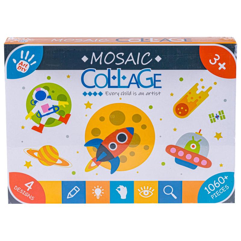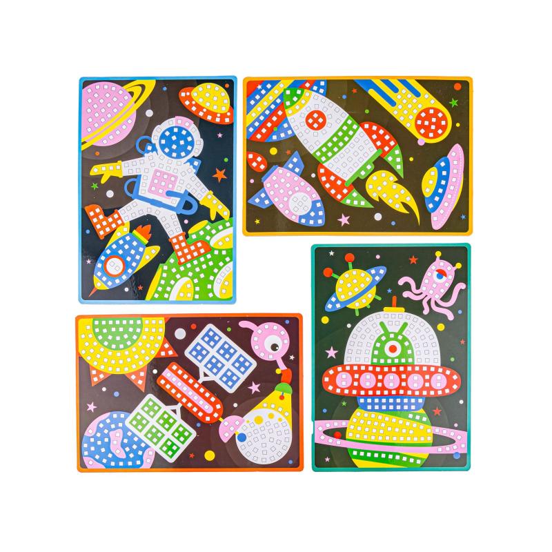 Zestaw składa się z 4 plansz do wyklejenia przedstawiających motywy w uniwersalnej tematyce kosmosu oraz piankowych naklejek w sześciu kolorach: czerwonym, białym, różowym, żółtym, niebieskim oraz zielonym. Do kompletu dołączone są również 4 podstawki do złożenia, które pozwalają ustawić gotowe prace w formie stojącej dekoracji. Po skończonej zabawie wszystkie elementy można schować w oryginalnym opakowaniu, co ułatwia utrzymanie porządku i przechowywanie zestawu do kolejnego użycia.