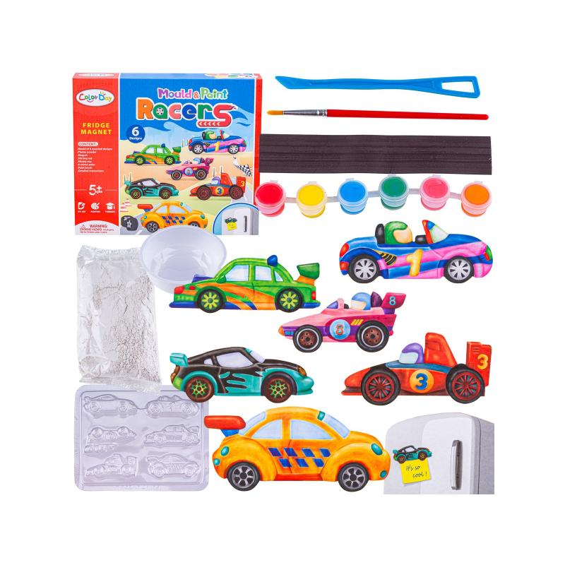 - Zawartość zestawu: forma na 6 samochodów, magnes z taśmą klejącą, pędzelek, farbki, miseczka, szpatułka do mieszania, gips, oryginalne opakowanie
