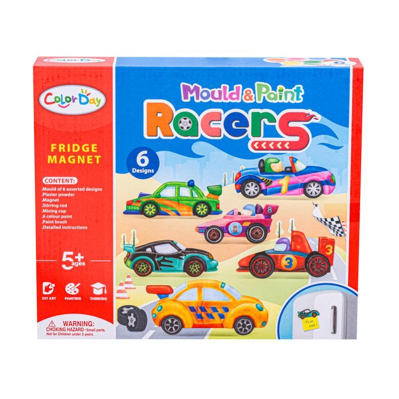 W opakowaniu znajduje się wszystko, co potrzebne, by wylać, pomalować i przymocować magnesy: forma do odlewu sześciu samochodów wyścigowych, gips, miseczka do mieszania, szpatułka, pędzelek, zestaw farbek w sześciu kolorach oraz magnes z taśmą klejącą. Dzięki temu nie trzeba kompletować narzędzi ani dodatkowych materiałów — od razu można zacząć tworzyć własne, niepowtarzalne dekoracje na lodówkę czy tablicę magnetyczną.