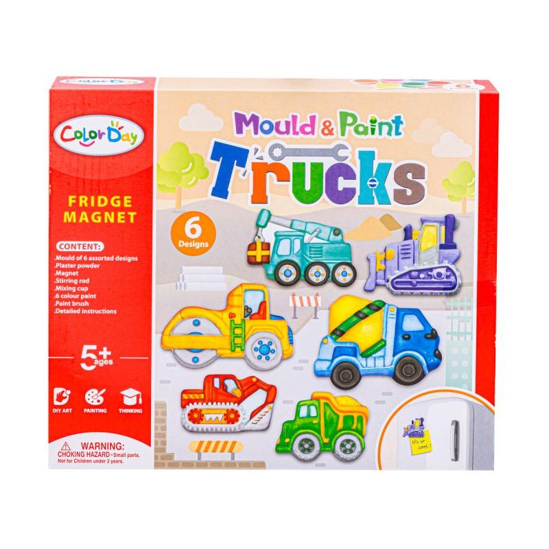 Zestaw Magnes CIĘŻARÓWKI DIY — 6 wzorów do odlania, forma 16 × 13,5 cm i opakowanie 27 × 23 × 5,3 cm, gotowy komplet dla małego twórcy. Zestaw zawiera formę na pojazdy z placu budowy, magnes z taśmą klejącą, pędzelek, farbki (pomarańczowy, różowy, niebieski, żółty, zielony, czerwony), miseczkę, szpatułkę i gips, więc wszystko, by samodzielnie odlać, pomalować i przykleić dekoracje na lodówkę. Zabawa gipsem rozwija zdolności manualne, koncentrację i wyobraźnię, a gotowe magnesy są unikatowe i świetnie nadają się jako prezent lub element domowej dekoracji dla dziecka.