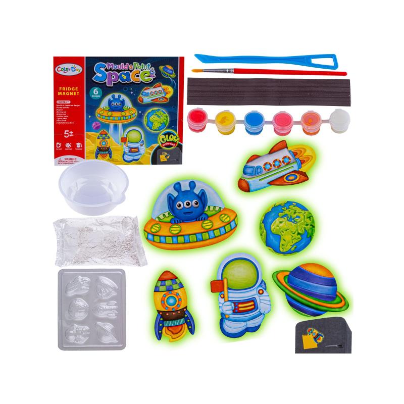 Zestaw Magnes Kosmos DIY — kreatywny zestaw do odlewu 6 wzorów, forma 17,8 × 15,3 cm, magnes ok. 5,2 × 4,3 cm, idealny do zabawy dla dzieci. W komplecie znajdziesz formę, magnes z taśmą klejącą, pędzelek, miseczkę, szpatułkę i gips oraz zestaw farbek w sześciu kolorach: pomarańczowy, różowy, niebieski, żółty, biały i czerwony. Zestaw umożliwia samodzielne odlewanie i malowanie unikatowych magnesów, rozwijając zdolności manualne, koordynację i wyobraźnię dziecka. Gotowe magnesy łatwo przymocować na powierzchni — świetne jako prezent lub dekoracja szkolnej tablicy.