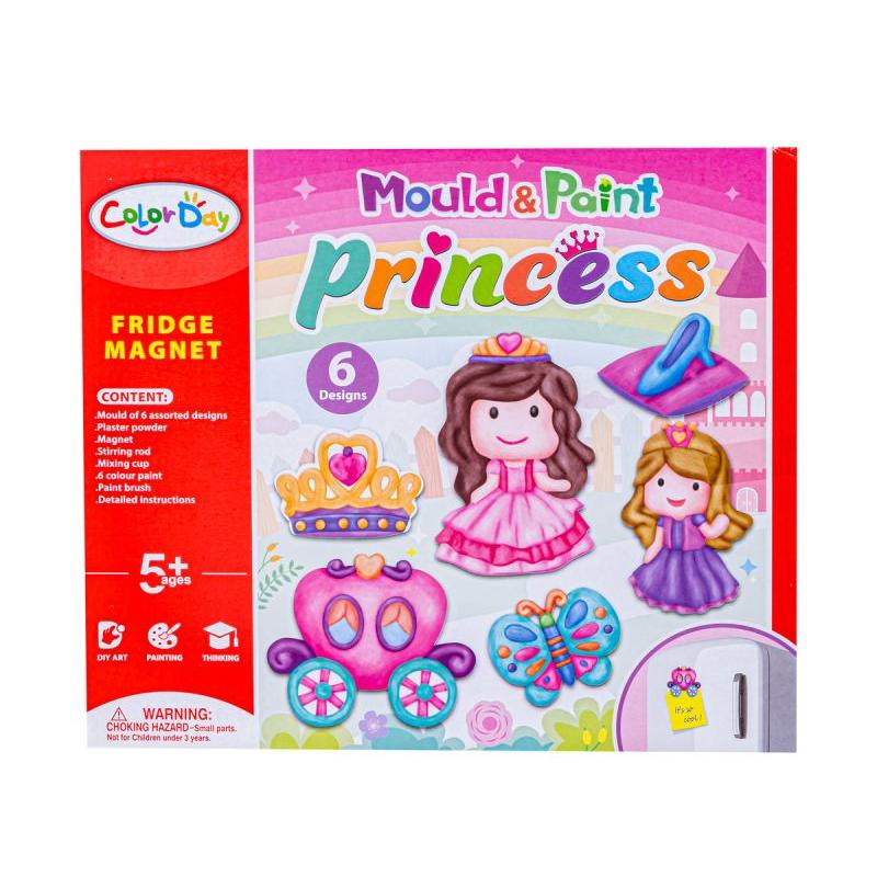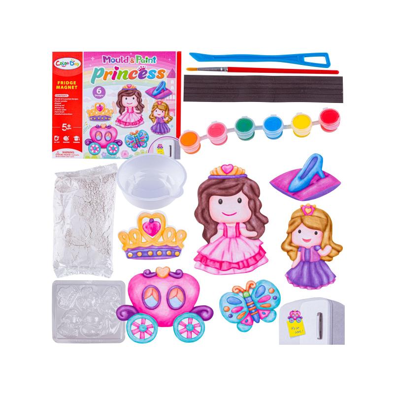 Zestaw Magnes Księżniczka DIY — forma 16 × 13,8 cm, 6 wzorów i magnes ok. 4 × 6 cm oraz opakowanie 27 × 23 × 5,3 cm, kompletny zestaw do odlewu i malowania. W pudełku znajdziesz formę, gips, farbki w sześciu kolorach, pędzelek, miseczkę, szpatułkę i gotowe taśmy magnetyczne — wszystko do samodzielnego stworzenia aż sześciu unikalnych magnesów w tematyce księżniczek. Zabawa polega na odlewaniu, malowaniu i przyklejaniu magnesów, co ćwiczy zręczność ręki, koordynację wzrokowo-ruchową i kreatywność dziecka. Idealne na prezent lub twórczą aktywność w domu.