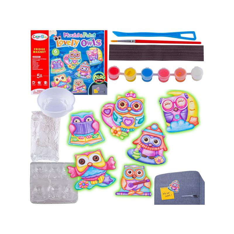 Zabawa polega na odlewaniu aż 6 różnych wzorów sówek, a następnie malowaniu i przyklejaniu magnesów. Efekt końcowy jest trwały i daje dużo satysfakcji, ponieważ każdy magnes będzie unikatowy — idealny zarówno do zabawy, jak i jako drobny prezent.