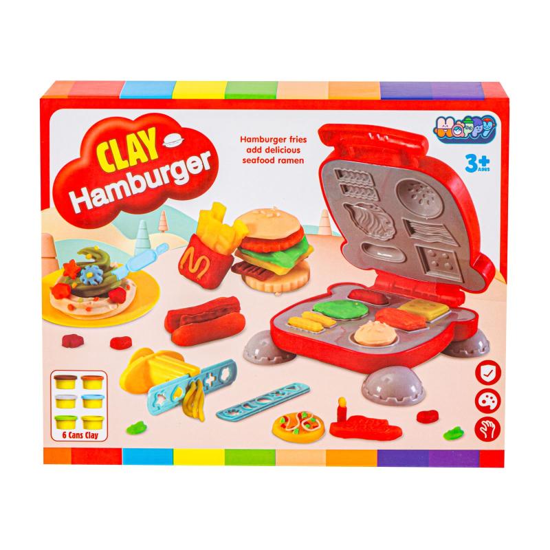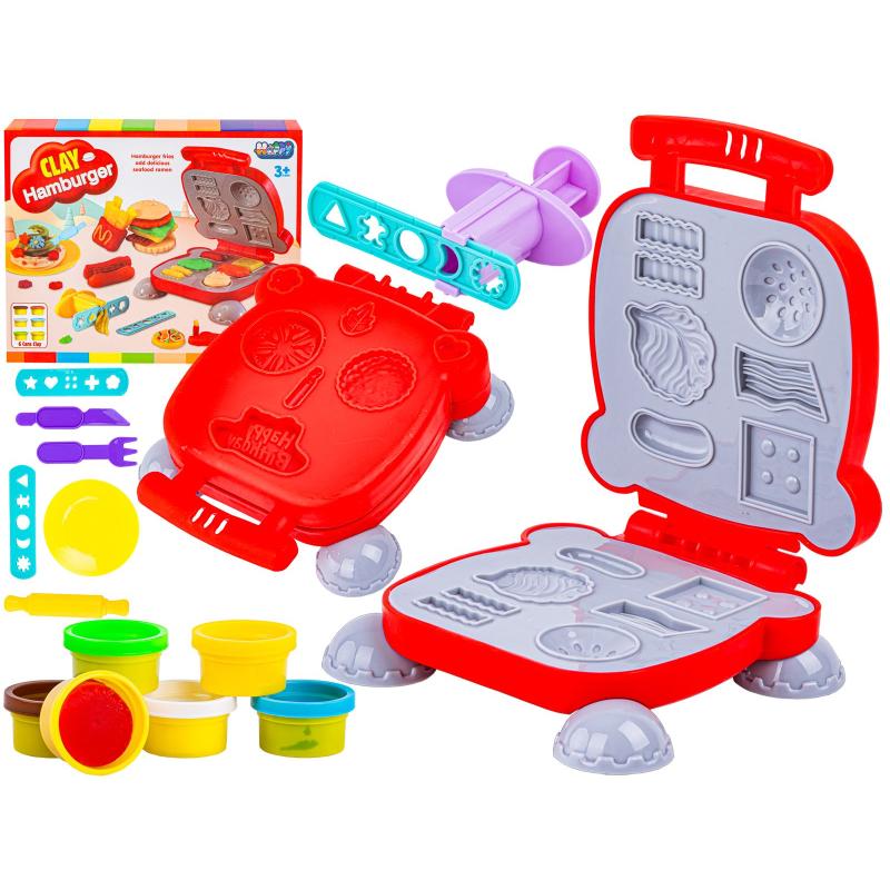 W pudełku znajduje się wszystko potrzebne, by samodzielnie stworzyć piętrowego hamburgera i inne smakowite elementy: maszynka do odciskania w kształcie tostera, ręczna wyciskarka do makaronu z dwoma wymiennymi nakładkami, wałek, talerzyk, widelczyk, nożyk oraz ciastolina w sześciu kolorach. Dzięki tym narzędziom dziecko może wałkować, wyciskać, kroić i odciskać przeróżne kształty — od bułki przez sałatę aż po makaron.