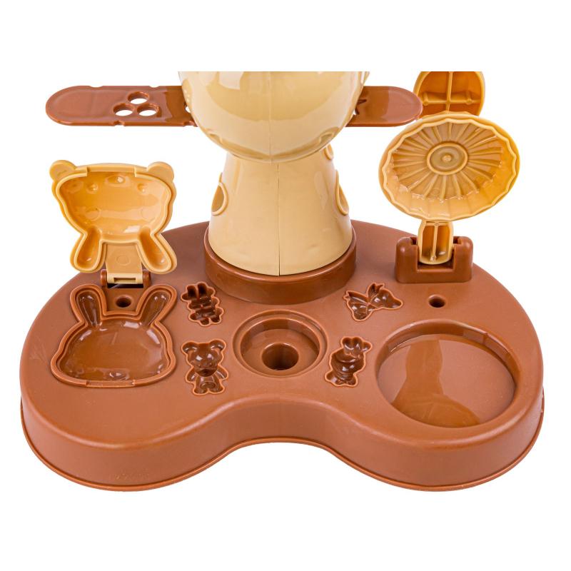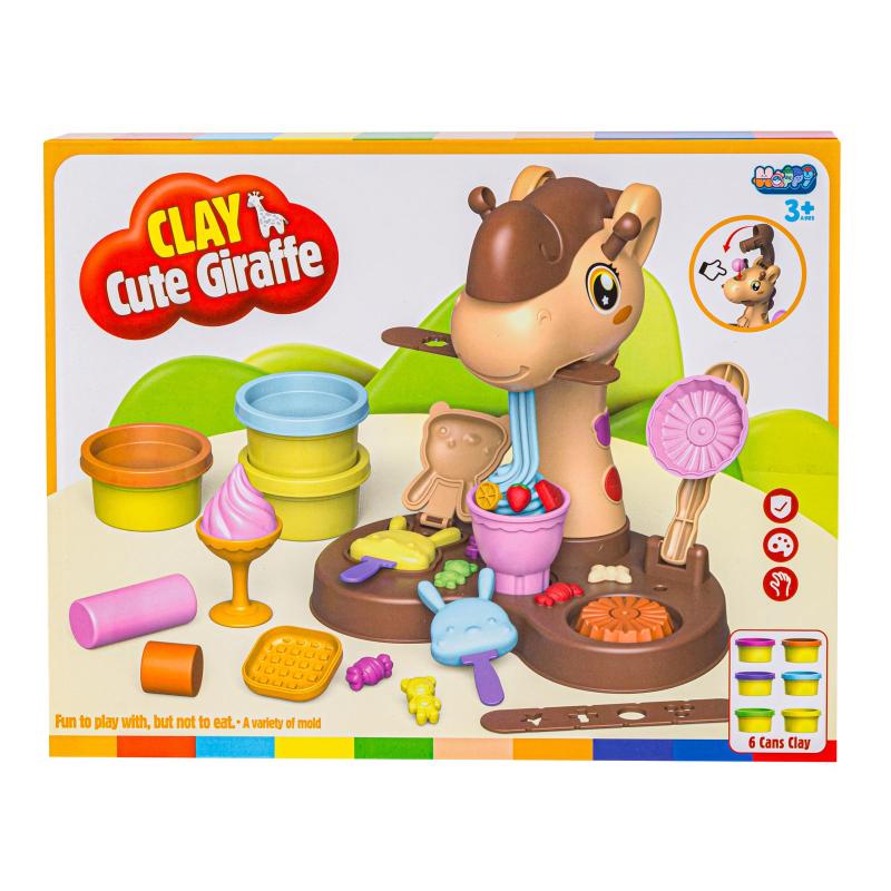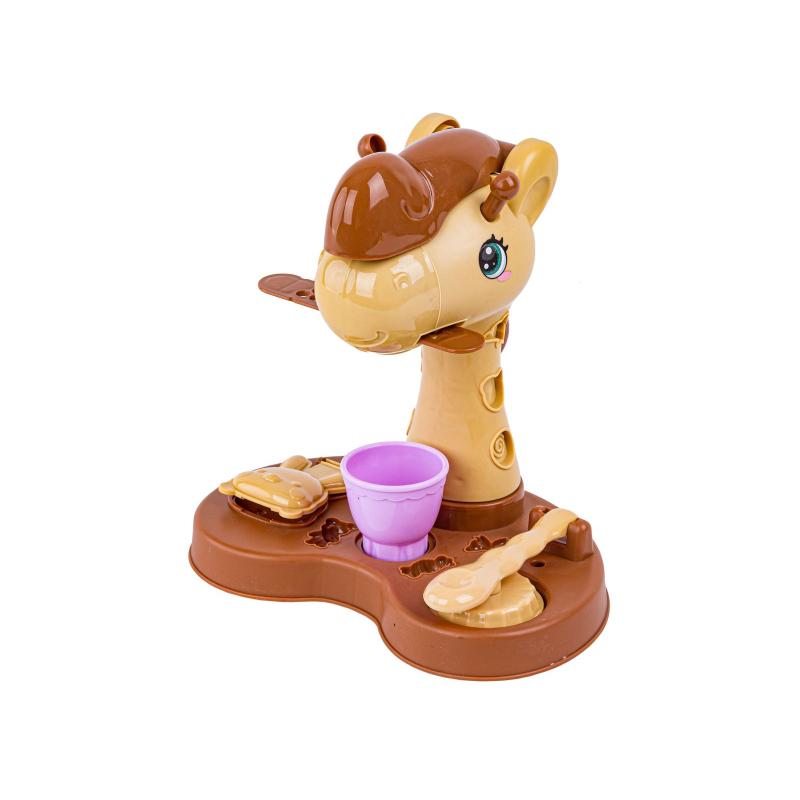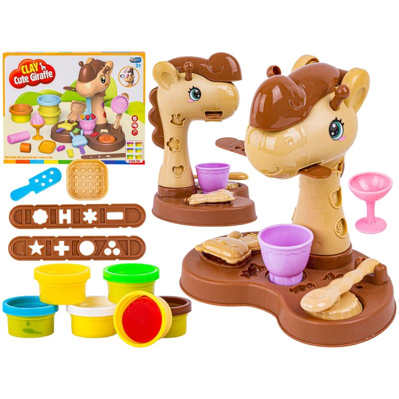 - Zawartość zestawu: maszynka z głową żyrafy, tuby z ciastoliną (6 kolorów), miseczka, kieliszek, 2 wymienne wkłady do makaronu, patyczek do loda, forma do odciskania (gofr), oryginalne opakowanie