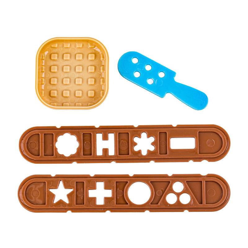 Bawiąc się, dziecko użyje również miseczki i kieliszka do serwowania „dań”, dwóch wymiennych wkładów do makaronu o różnych kształtach, patyczka do lodów oraz formy do odciskania (gofr). Całość zapakowana jest w oryginalne opakowanie, dzięki czemu zestaw świetnie sprawdzi się też jako prezent.