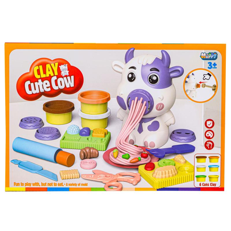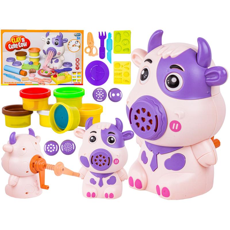 - Zestaw zawiera: krówkę, korbkę do wyciskania makaronu, 4 nakładki do wyciskania, tuby z ciastoliną w 6 kolorach, 2 foremki do odciskania, nożyczki, talerzyk, widelczyk oraz nożyk, oryginalne opakowanie