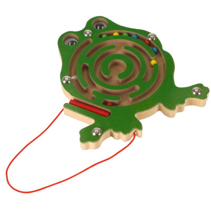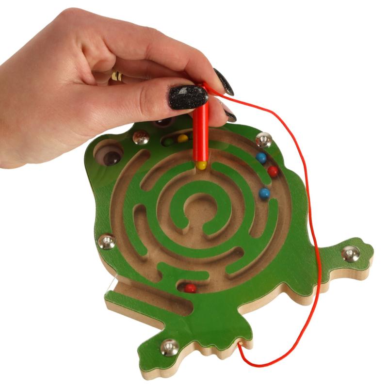 Ta niewielka zabawka wyróżnia się prostą, ale angażującą formą. Metalowe kuleczki umieszczone w labiryncie można przesuwać za pomocą specjalnego rysika z magnesem, co sprzyja rozwojowi zdolności manualnych oraz logicznego myślenia. Obracanie żabki sprawia, że zadanie staje się ciekawsze i wymaga większej precyzji, dzięki czemu maluch uczy się cierpliwości i wytrwałości.