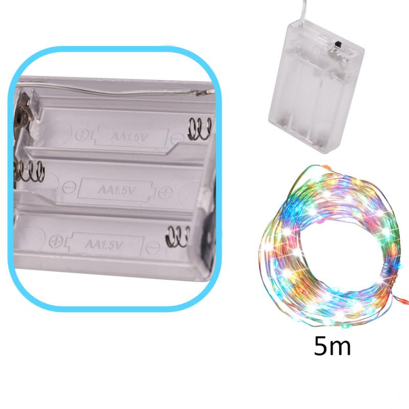 Lampki LED druciki dekoracyjne świąteczne choinkowe o długości 5 m z 50 kolorowymi diodami LED to elastyczne oświetlenie na baterie (3 x AA, brak w zestawie). Cieniutki drucik pozwala łatwo ukryć lampki w dekoracjach, tworząc nastrojowy klimat zarówno w trakcie świąt, jak i na co dzień jako delikatne oświetlenie. Zestaw świetnie sprawdzi się w dekoracjach DIY, na przykład w szklanych butelkach lub słoikach, a jego mobilność zapewnia brak kabli i gniazdek. Wymiary pojemnika na baterie to 7,5 × 5 × 2,5 cm, co ułatwia dyskretne umieszczenie zasilania.