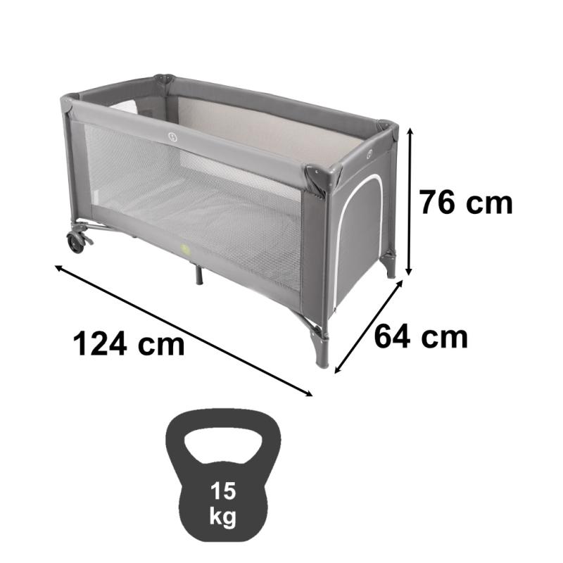 Łóżeczko dziecięce turystyczne składane z materacem do 15 kg to samorozkładająca się konstrukcja o wymiarach wewnętrznych 60×120 cm. Posiada stabilny aluminiowy stelaż w kształcie X, dwie stopki antypoślizgowe oraz dwa kółka z blokadą. W zestawie znajduje się materac z rzepami (60×117×1 cm), torba z rączkami i instrukcja obsługi. Wysokość łóżeczka to 76 cm, szerokość 124 cm, głębokość 64 cm, a po złożeniu 23×24×80 cm. Materiał wykonania to 100% poliester z siatką wentylacyjną z trzech stron. Przeznaczone dla dzieci w wieku 0–36 miesięcy i wadze do 15 kg. Produkt marki KIK Sp. z o.o. Sp.k.