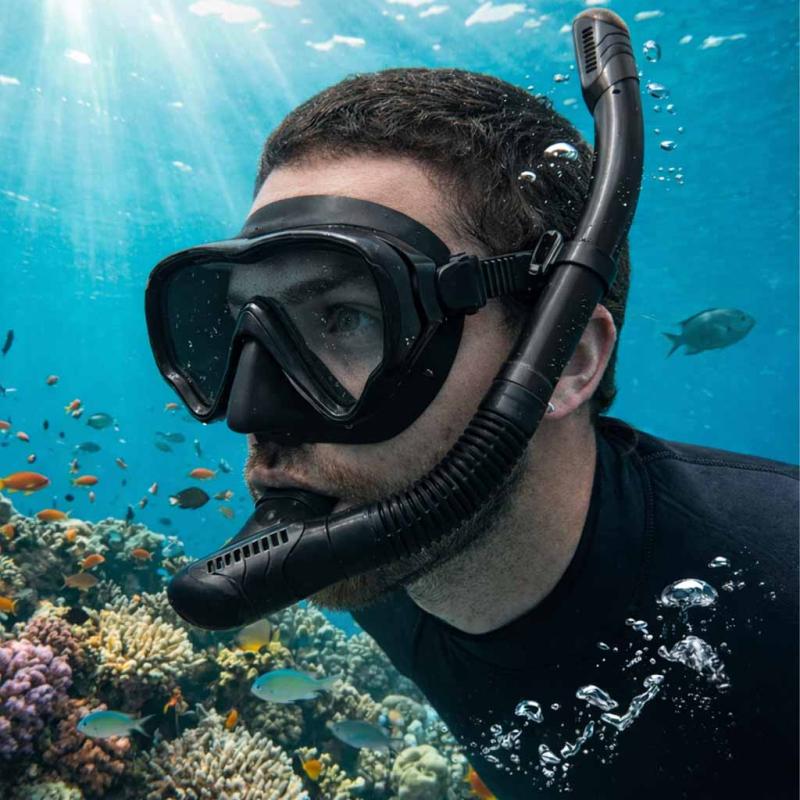 Po każdym użyciu przepłucz maskę i rurkę czystą słodką wodą, aby usunąć sól i piasek, a następnie pozostaw do wyschnięcia w cieniu. Unikaj długotrwałego wystawiania elementów na bezpośrednie działanie słońca, co może osłabić silikon i poliwęglan.